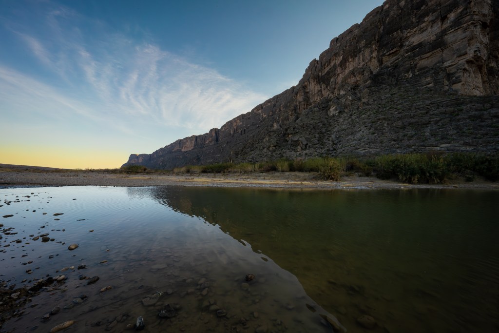 The trail itself was mostly paved, to my surprise, and came equipped with several podiums and information along the way. As we plod up the cliffside and bank down to the riverbank, our footsteps echo a bit further and a bit louder. Bamboo is pervasive here, and beaver dens dot the undergrowth. The frigid waters of the Rio Grande flow gently and quietly, as if a courtesy to the silence and isolation. The evening sun sank below the cliffside, and the canyon wren’s began their song. Meandering under boulders and bamboo, we reach the end of the bank, looking deep into the canyon proper. Looking up along the canyon walls really tells the story of how long the river took to carve its way through. Maybe not a giant, but grand nonetheless. We exit the canyon to an amazing deep violet sunset, complimenting the southern rim of the Chisos.