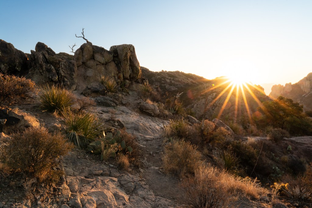 While the trail length is a moderate 2mi, its the 1,400ft elevation gain that kept us winded as we ascended the mountainside. Towards the top of the trail, the sun broke the horizon and began its brushstrokes. The northwestern ridge awash in the morning sun was a wonderful way to say good morning to the Chisos Mountains.