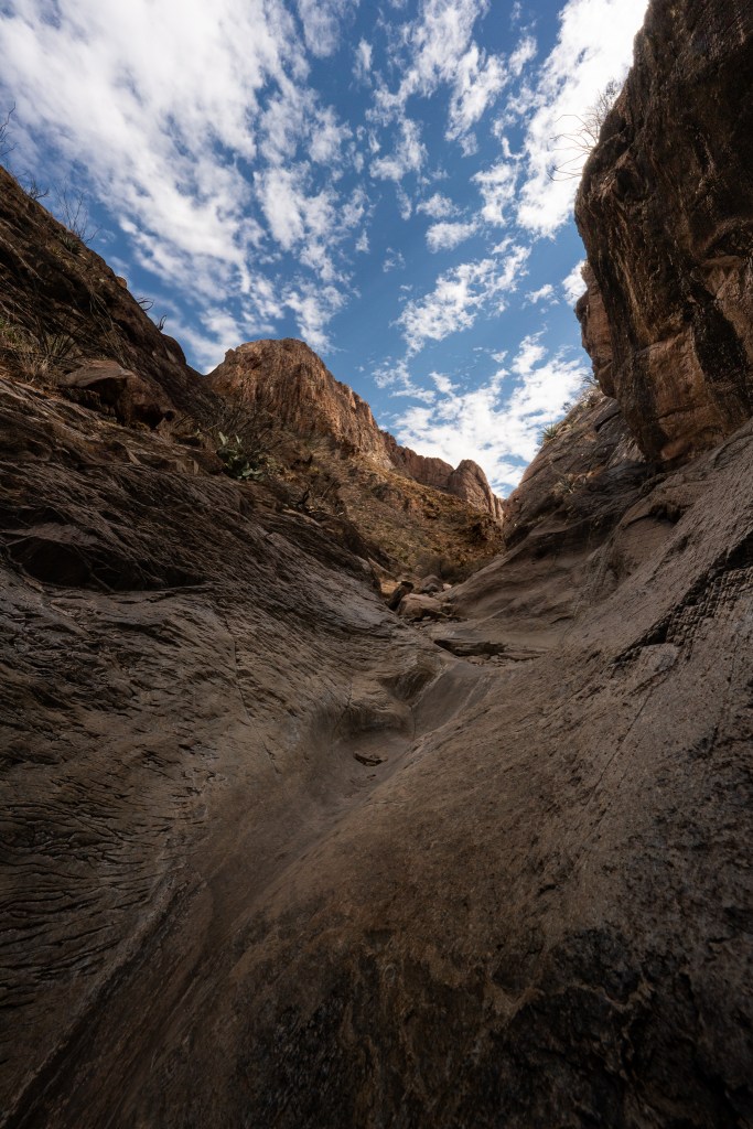 A full day ahead, and a full stomach re-invigorated our desire for the hike, and we ultimately decided to take on the Window. The Basin itself is nestled high above the lowlands and due to its bowl shape encircled by the Chisos water, and cold mountain air, have only one place to go: down! The Window is so named as it is the “window” to the desert from the basin, and the view matches! We set off from the lodge and began our descent into the plains. The trail meandered under mesquite and pine, until it met with a creek. Well, the creek didn’t exist for us but during the rainy season I’m sure it does. From the lodge, the mountain ridges seem so small despite only being two miles away, but we soon discovered during our descent they are no less grand than the other’s we had seen prior.