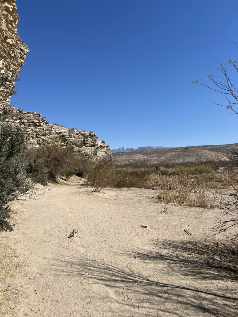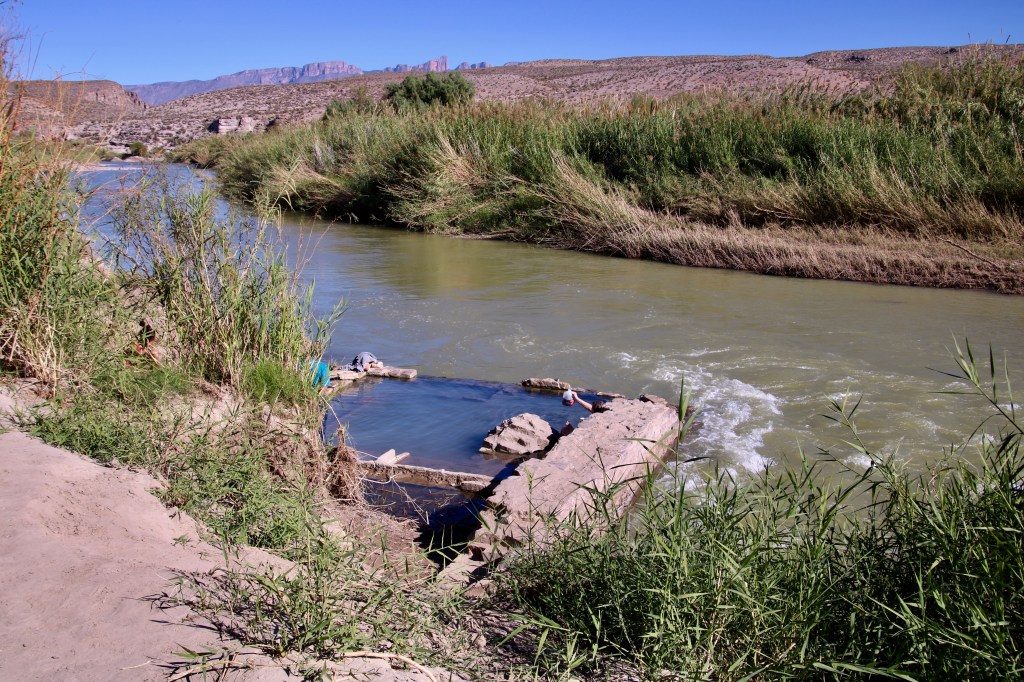 Walking through the abandoned hot springs village nestled alongside craggy cliff sides, the Rio Grande came into view. Running between the Mexican plains and the Texan cliffs, it meandered around a corner as if to greet our trail. Just behind some tall reeds, we heard some festivities and caught a glance of a dilapidated foundation. If the arid heat wasn’t so oppressive, the mineral water bubbling up from the bathhouse ruins would surely be steaming. I kicked off my shoes and socks, and hopped into the bathhouse waters. It was definitely hot! Even still, stepping back out of the water felt cool again, and while I didn’t stay long enough to enjoy much of the mineral benefits, I like to pretend I got something out of it.